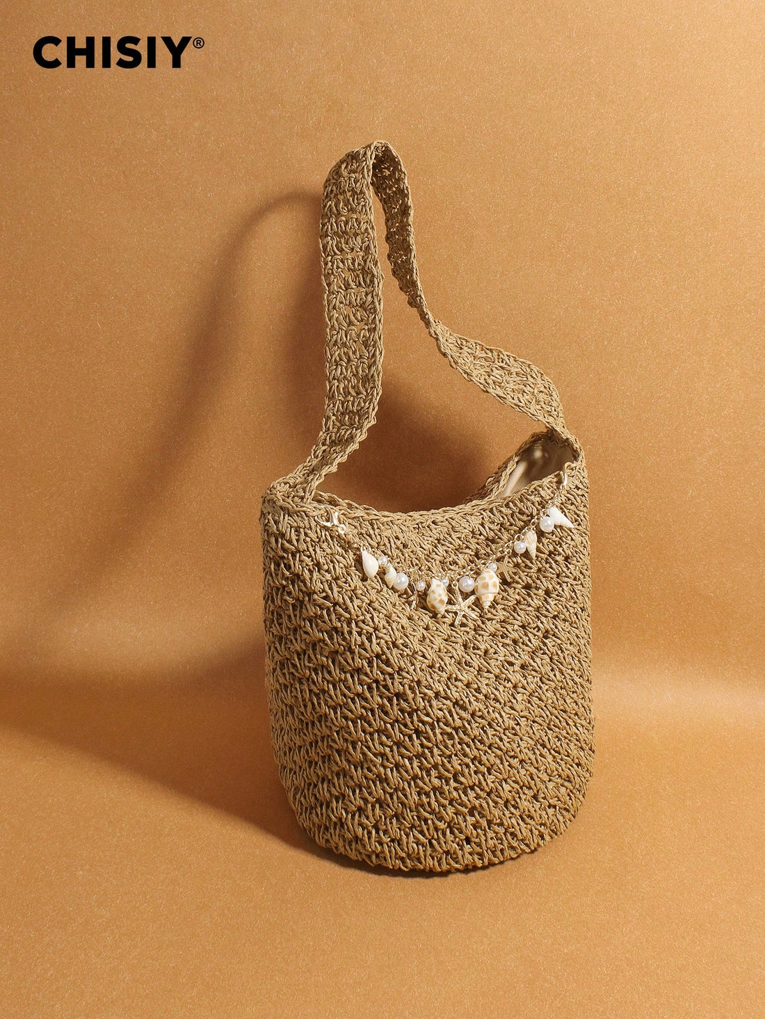 Original Handmade New Retro Woven Shoulder Bag, Summer Seaside Vacation Grass Woven Bag, Shell Starfish Hanging Decoration Bucket Bag, Large Capacity Commuting Handbag, Seaside Vacation Beach Bag, Daily Commuting Beach Leisure Party Travel