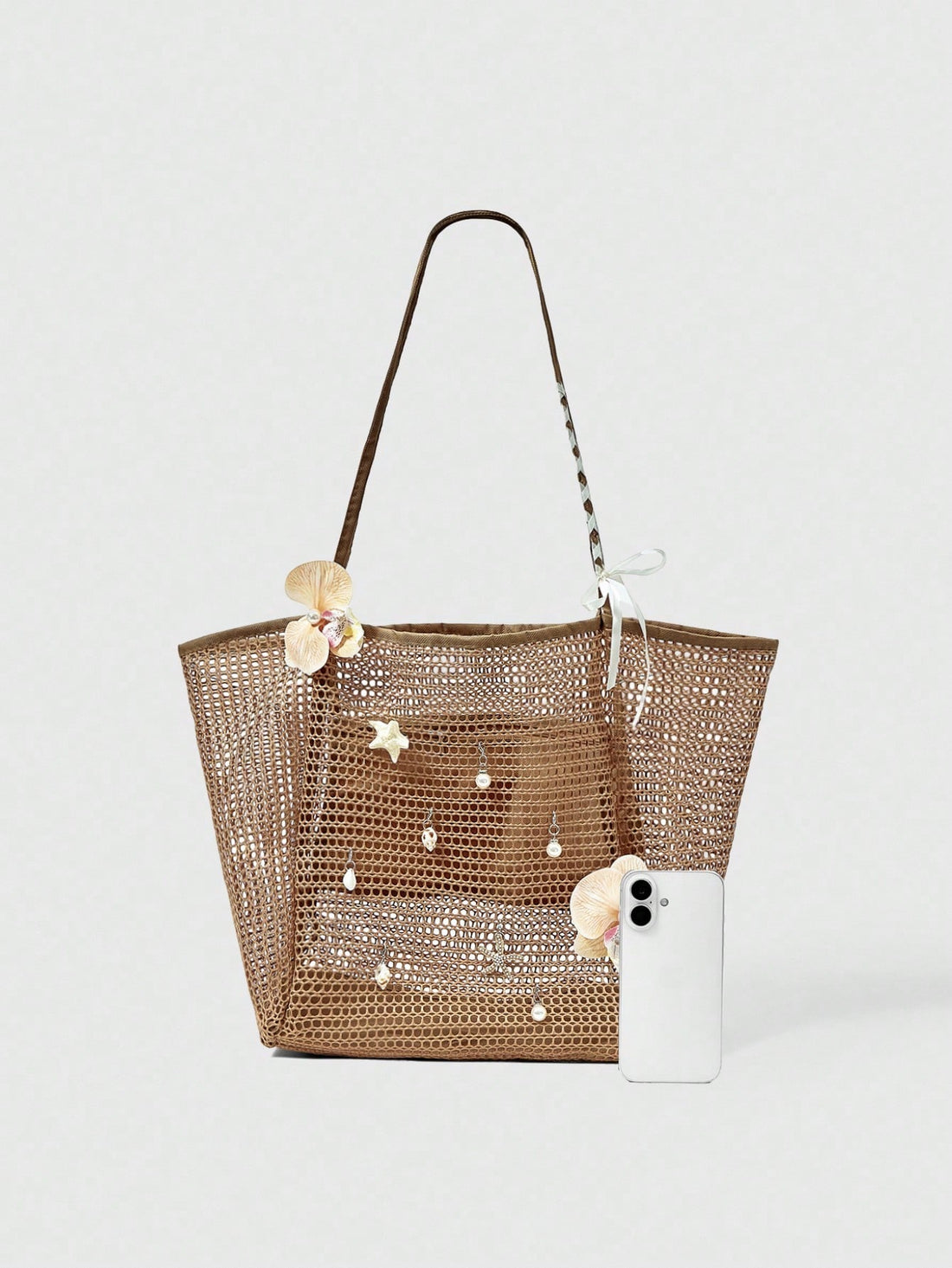 Large Capacity Crochet One Shoulder Tote Bag - Lightweight, Multifunctional Knitted Handbag, Beige, Pink, Brown, Black, Suitable For Travel, Beach, Vacation And Daily Use,