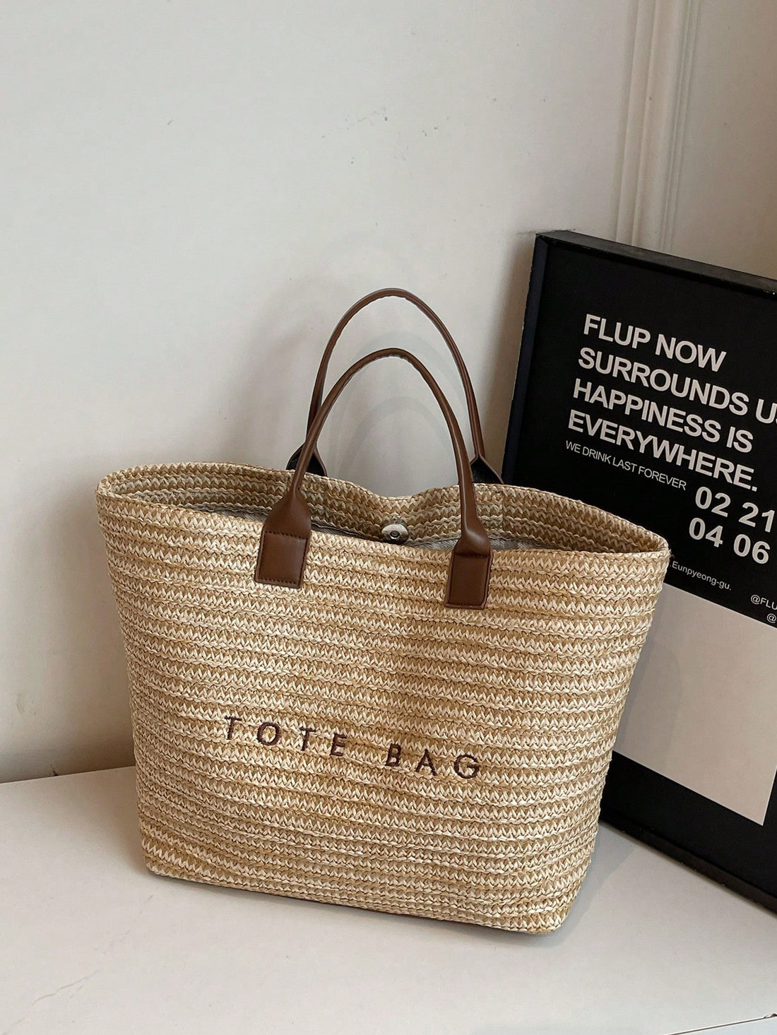 New Large Capacity Letter Decor Woven Straw Tote Bag, Multi-Functional Commute Casual Vacation Woven Straw Handbag Suitable For Commuting, Shopping, Beach Vacation, Office, Holidays