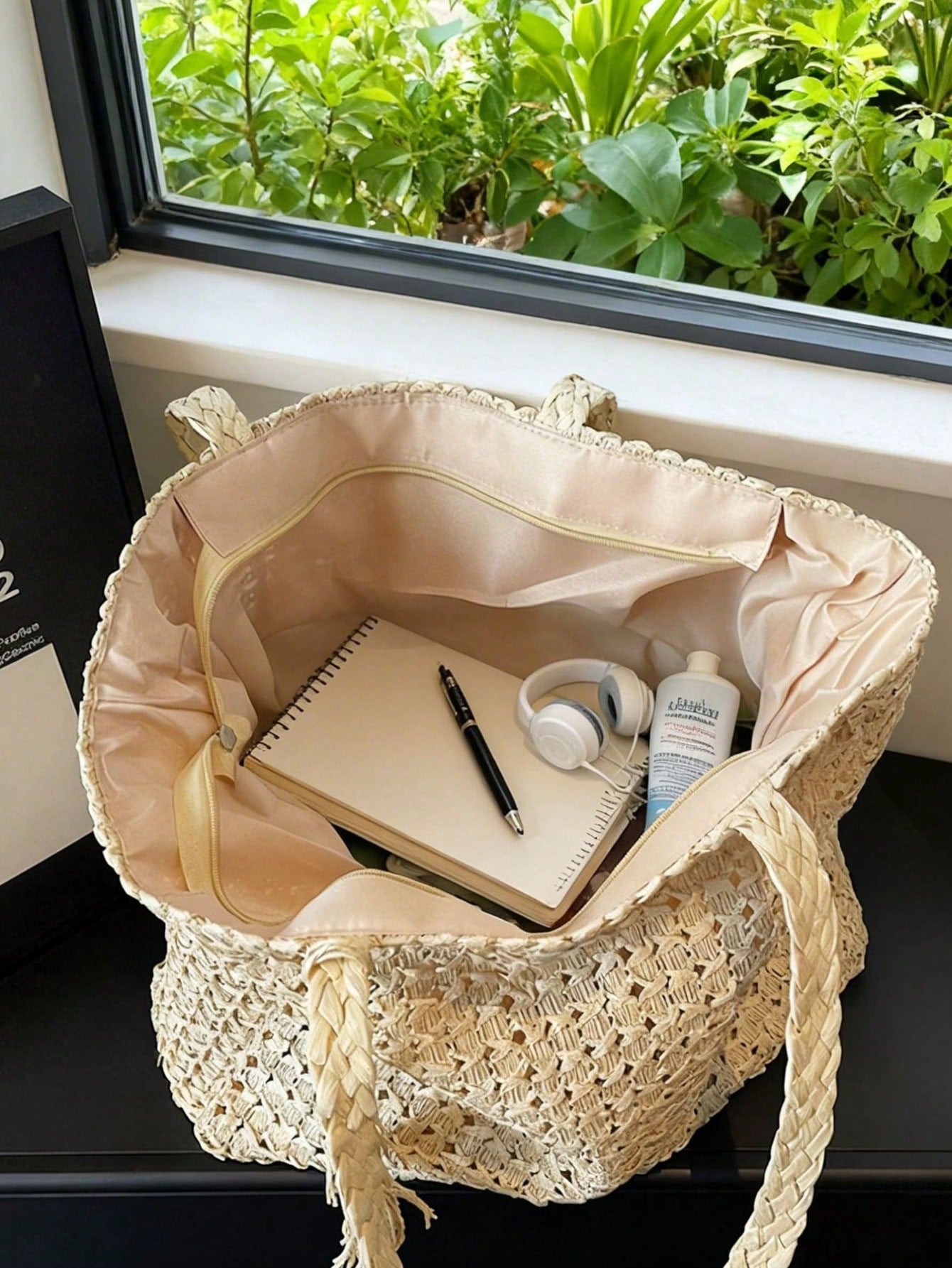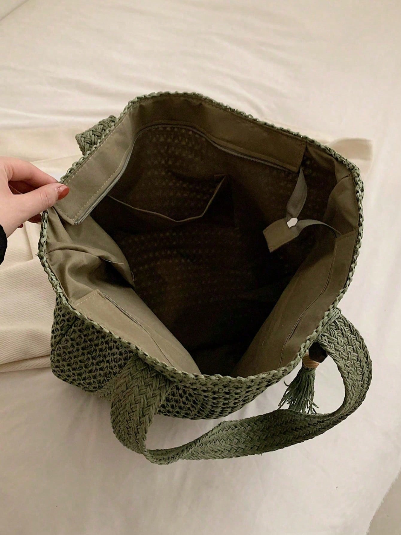 Women's Large Capacity Straw Vacation Beach Bag, Woven With Tassels, Shoulder Handbag Wallet, Casual Fashion Travel Bag, Portable Bohemian Foldable Tote , Bohemian Outfit For Women , Summer, Boho