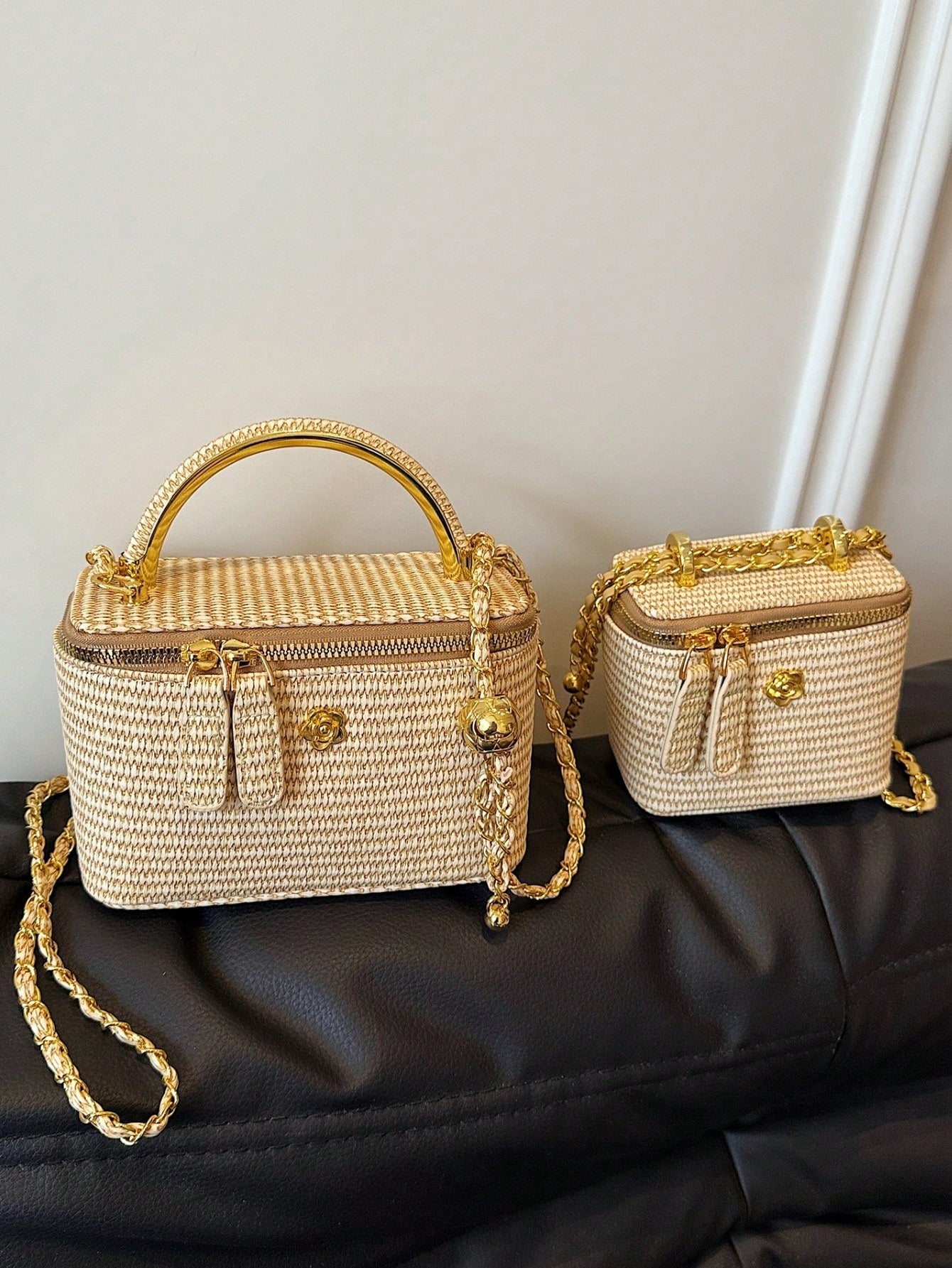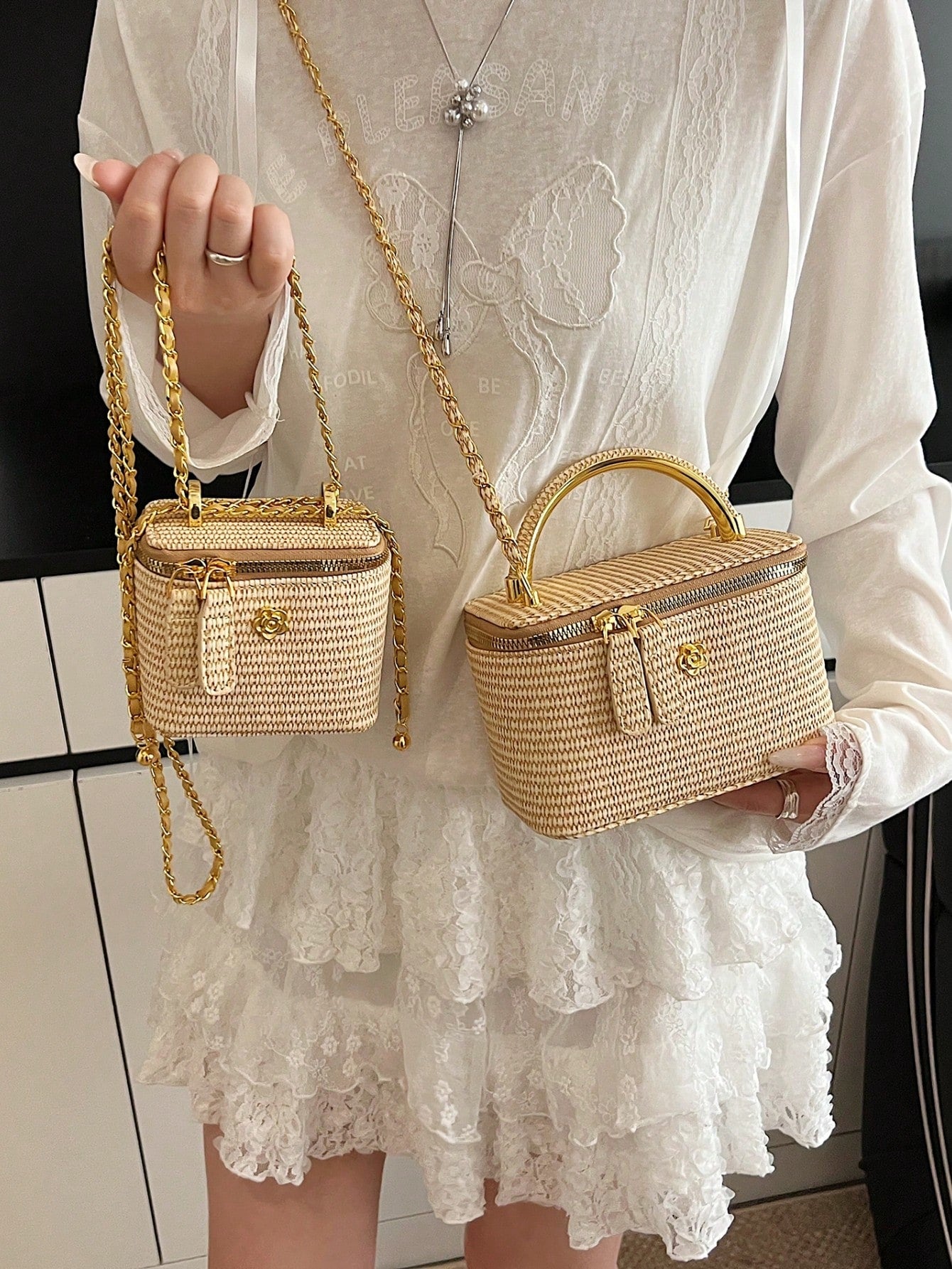 Woven Texture Handle Box-Shaped Handbag, Women's Spring/Summer New Fashion Chain Crossbody Small Square Bag, Versatile Beach Holiday Purse